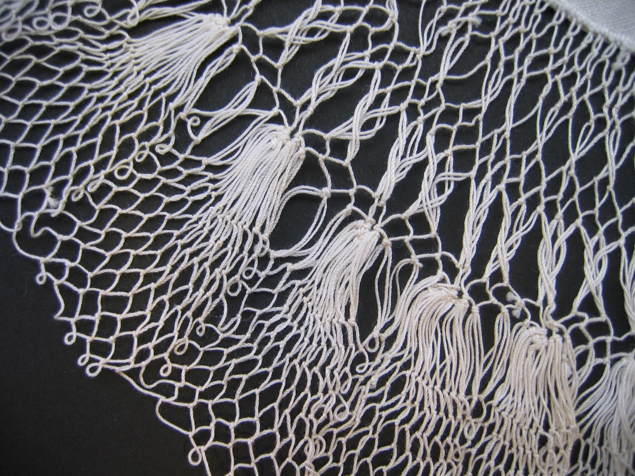 Rond kleedje met brede rand van netwerk. In het midden katoen, rondom open kant.