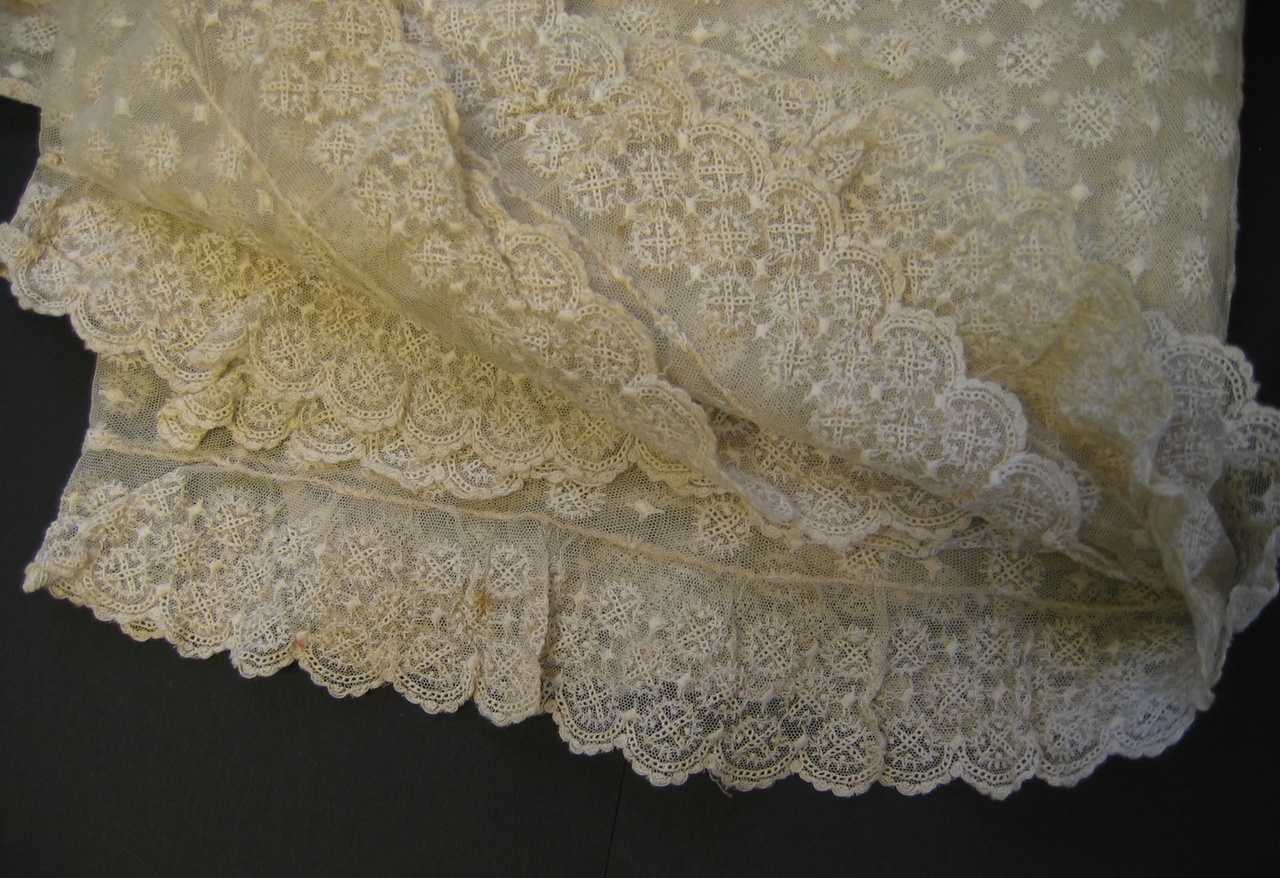 Het is waarschijnlijk machinale tulekant, en ook machinaal geborduurd.