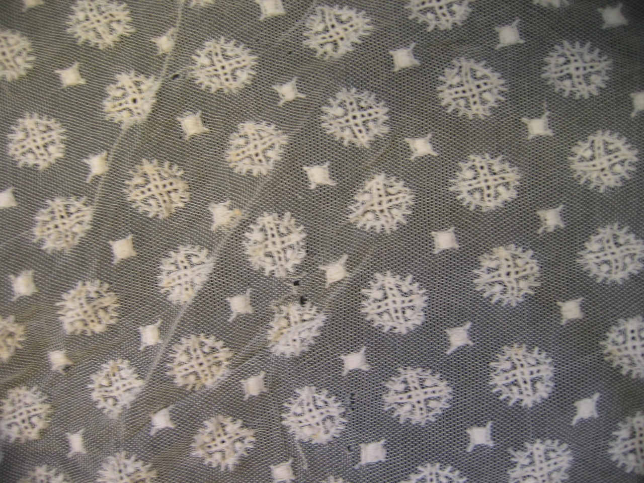 Gebroken wit wiegegordijn van tulekant, klein circel motief/dessin met midden in een kruisje, aan de rand is veel kant weggenomen.