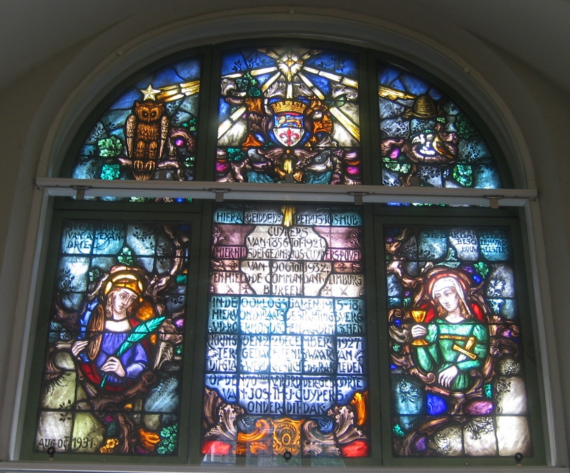 Op het rechter venster beneden is een vrouw afgebeeld met kelk en zwaard en de tekst: "St. Barbara, beschermvr. Bouwmeesters".