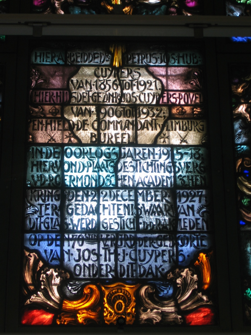 Het middelste raam onder is een tekstvenster. Het opschrift luidt: "Hier arbeidde Dr. Petrus Jos. Hub. Cuypers van 1856 tot 1921, hier huisde 't gezin Ir. Jos Cuypers-Povel van 1906 tot 1932; en hield de commandant v. Limburg bureel in de oorlogsjaren 1915-18; hier vond plaats de stichtingsverg. v.d. Roermondsche Academischen Kring den 22 December 1927 ter nagedachtenis waarvan dit glas werd gesticht d.d. RAK leden op den 70-sten verjrd. der geboorte van Jos.TH.J. Cuypers onder dit dak".