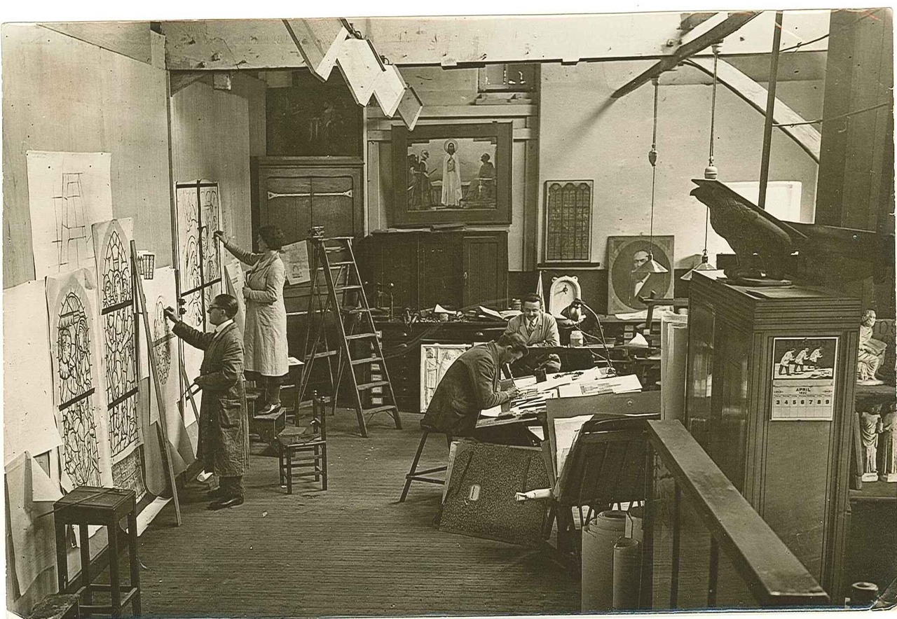 Het gedenkvenster werd vervaardigd in de Cuypers' Werkplaatsen door Clementine Mehl-Alberdingk. Op afbeelding 5979-4 is Tiny Alberdingk aan het werk te zien (deze foto is dezelfde als inv. nr. 0696/28-36).
