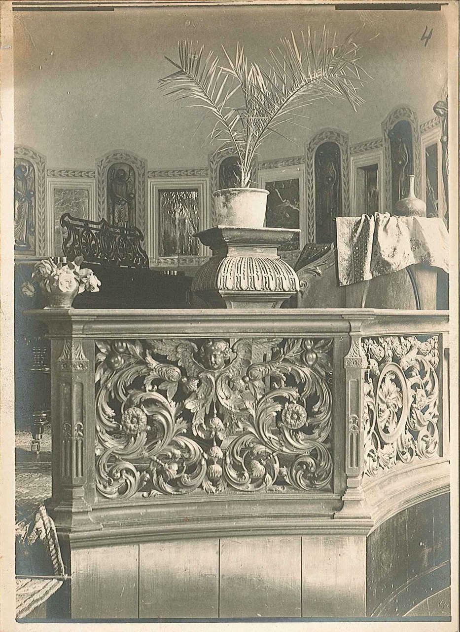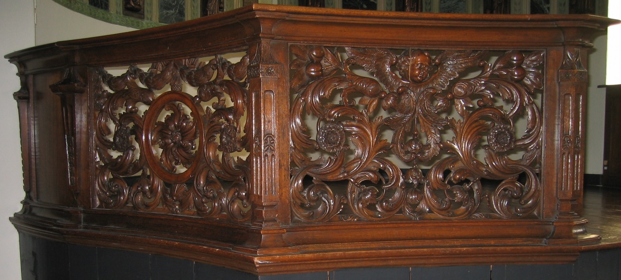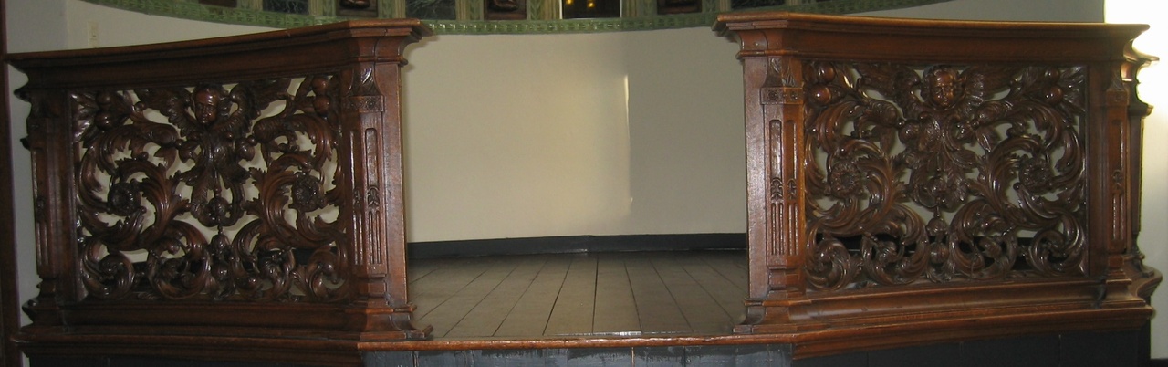 De balustrade is fraai versierd met florale motieven. Op de middelste twee panelen is een engelenhoofdje aangebracht.