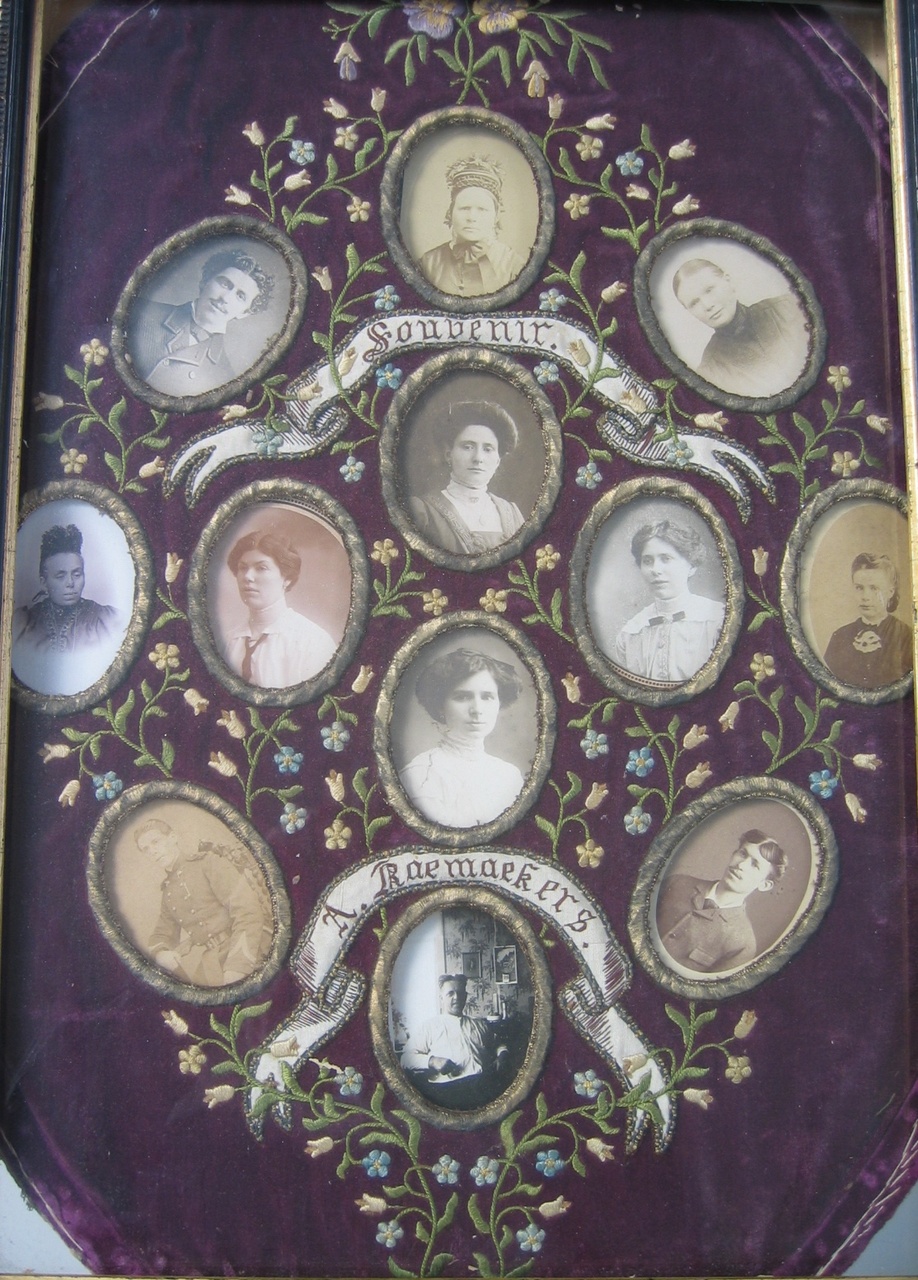 Ingelijste fotoverzameling waarin 12 fotoportretjes in een borduurwerk zijn bijeen gebracht met als titel "Souvenir A. Raemaekers".