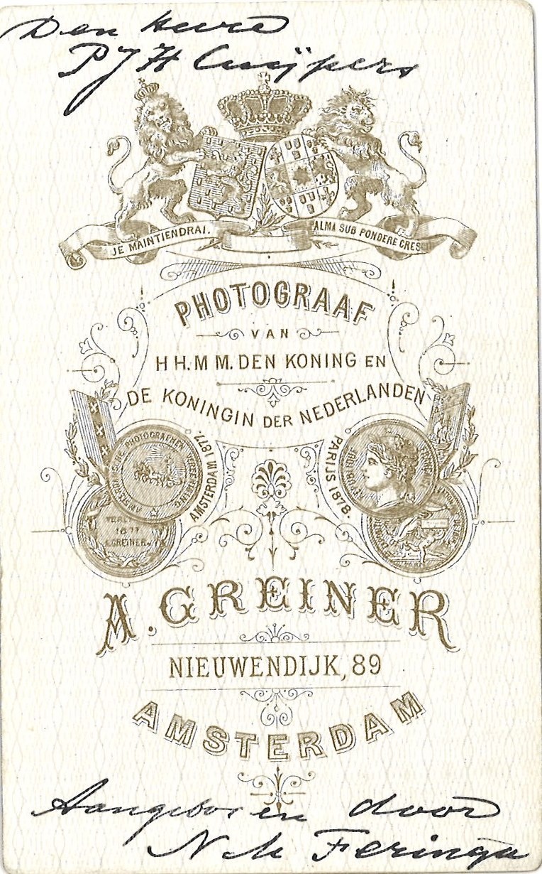 De foto is genomen in de fotostudio Albert Greiner, 1870 – 1879 te Amsterdam. Aan de achterkant het logo van Greiner: 'Photograaf H.H.M.M. den Koning en de Koningin der Nederlanden A. Greiner, Nieuwendijk 89 Amsterdam'.