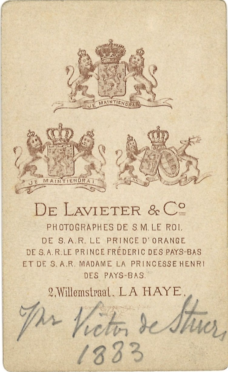 Jhr. mr. Victor Eugène Louis de Stuers (Maastricht, 20 oktober 1843 - Den Haag, 21 maart 1916) was een Nederlands advocaat, ambtenaar en politicus. Hij wordt algemeen beschouwd als de oprichter van de Nederlandse monumentenzorg. Foto gemaakt in de studio De Lavieter & Co te Den Haag.