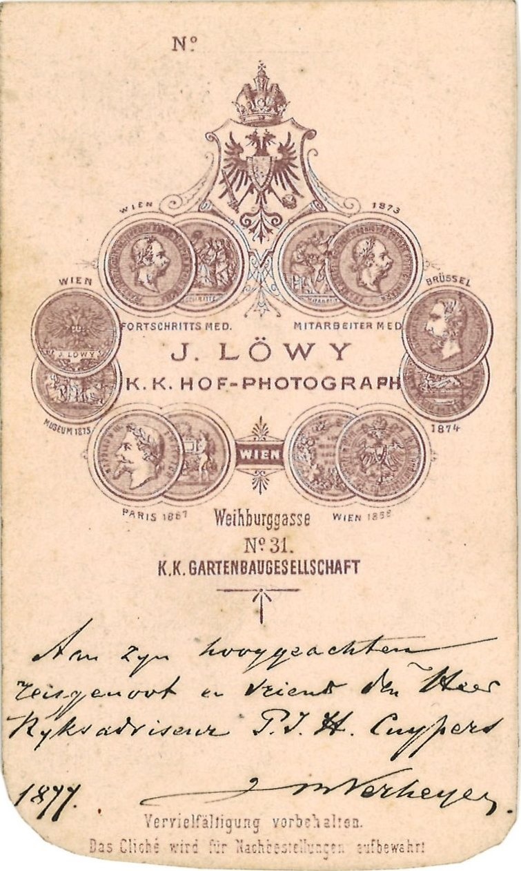 Portretfoto (carte-de-visite) van J.M. Verheijen, vriend en reisgenoot van Pierre Cuypers. Foto gemaakt in de studio J. Lowy K.K. hof-photograph te Wien.