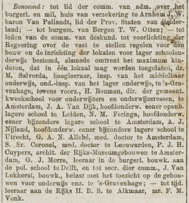 Portret van Samuel Senior Coronel, arts te Leeuwarden, lid van de regeringscommissie die een advies moest opstellen over de scholenbouw. De commissie werd officieel benoemd in 1879 (zie het krantenbericht uit het Rotterdamsch Nieuwsblad van 6 februari 1879); Pierre Cuypers was een van de leden.