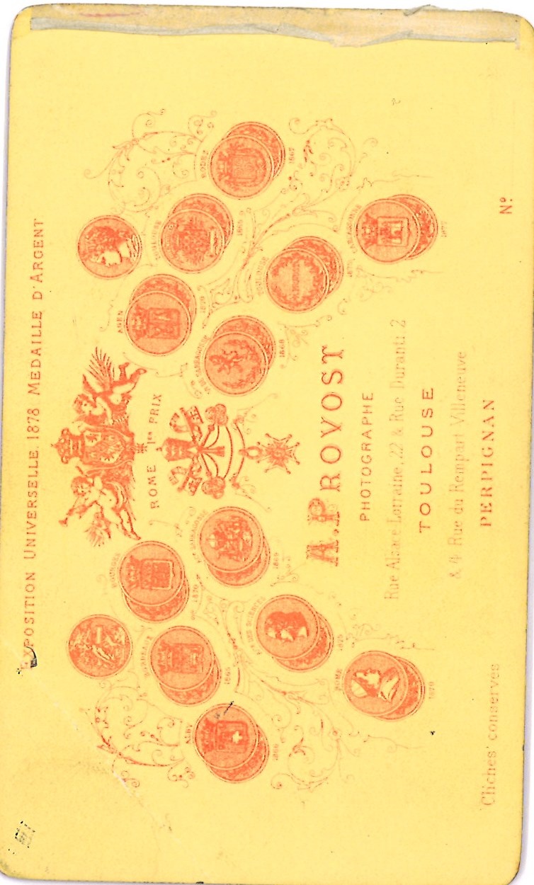 Op de achterzijde van het fotoportret, dat Viollet-le-Duc ten halve lijve, naar links kijkend, met witte vlinderdas toont, staat de naam van de fotograaf: A. Provost met vestigingen in Toulouse en Perpignan.