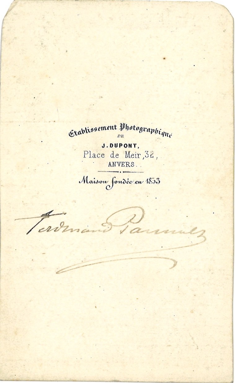 Op de achterzijde van het portret staat met potlood zijn naam geschreven en is de naam van de fotograaf afgedrukt:J. Dupont uit Antwerpen.