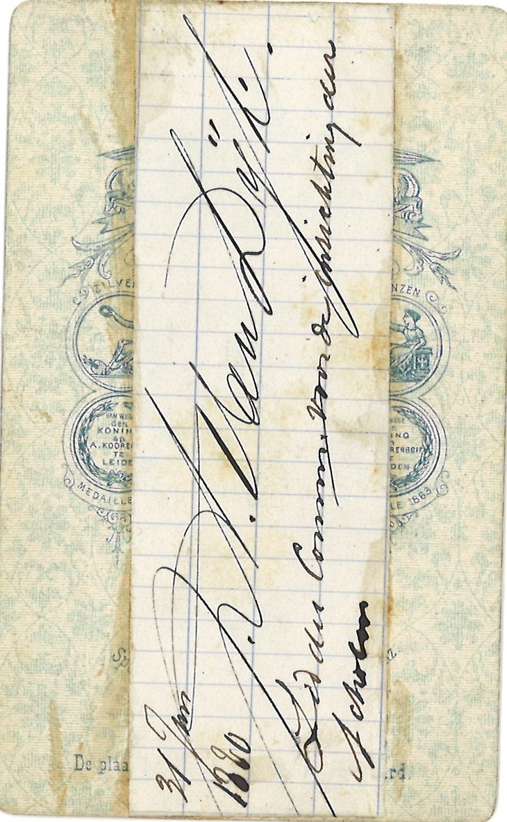 Op het etiket achterop staat de datum 31 januari 1880. De naam van de fotograaf staat niet zichtbaar onder het etiket afgedrukt.