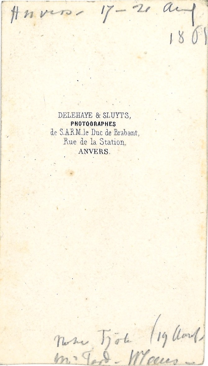Op de achterzijde staat ook de naam van de fotostudio vermeld: "Delehaye & Sluyts, Photograhes, de S.A.R.M. le Duc de Brabant, Rue de la Station, Anvers".