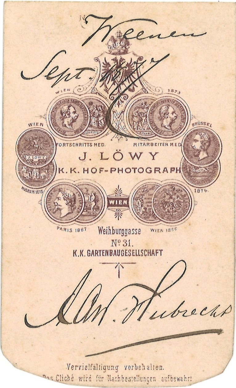 Op de achterzijde staat de naam van de fotograaf tussen vele medailles gedrukt: J. Löwy, k.k. Hof-Photograpf, Fortschritts. Med., Mitarbeiter Med., Wien, Weihburggasse No. 31, K.K. Gartenbaugesellschaft".