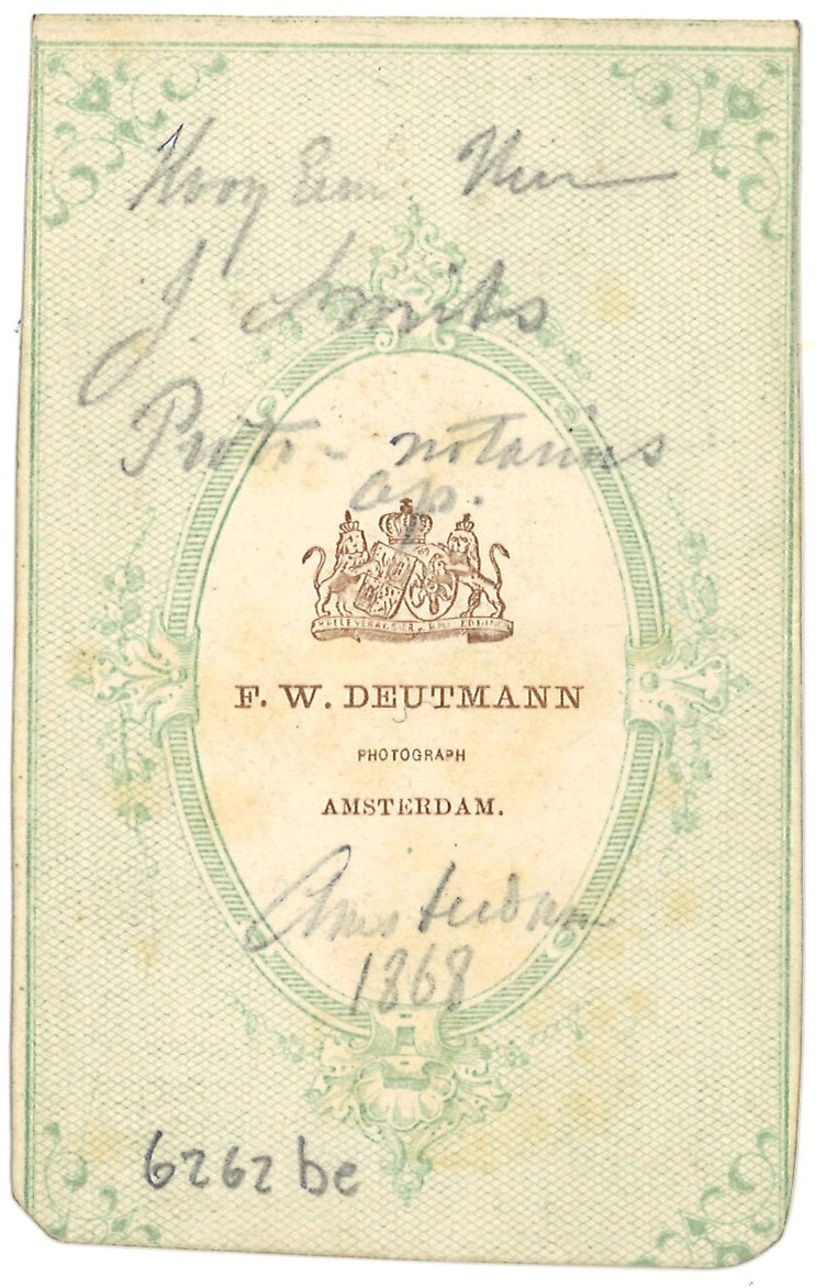 6262be. Op de foto is een priester afgebeeld. Op de achterzijde staat met potlood geschreven: "Hoog Eerw. Heer J. Smits, Proto-notarius ap. (apostolicus) Amsterdam 1868".