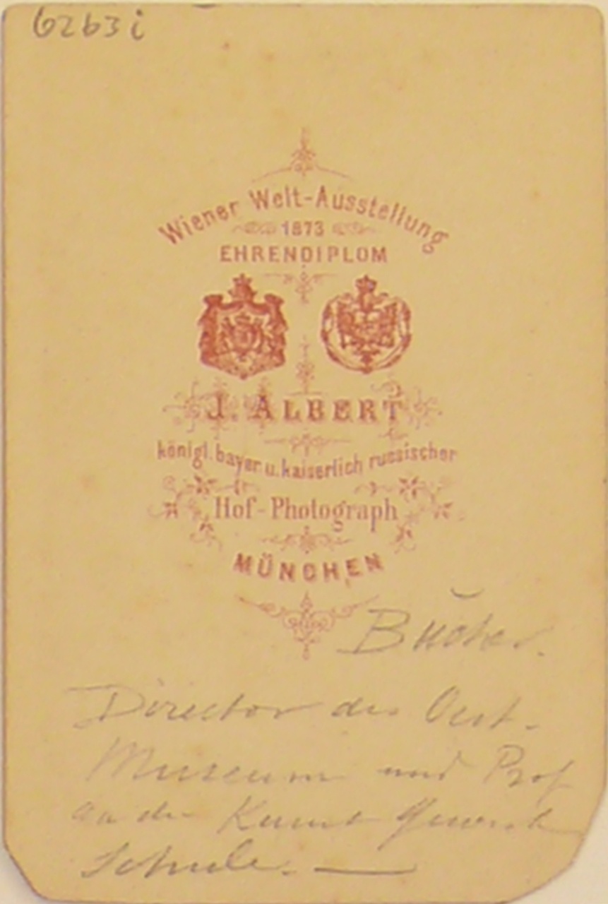 Op de achterkant is met potlood geschreven: 'Bucher Director des Oest. Museum und Prof an der Kunst-Gewerbeschule'.