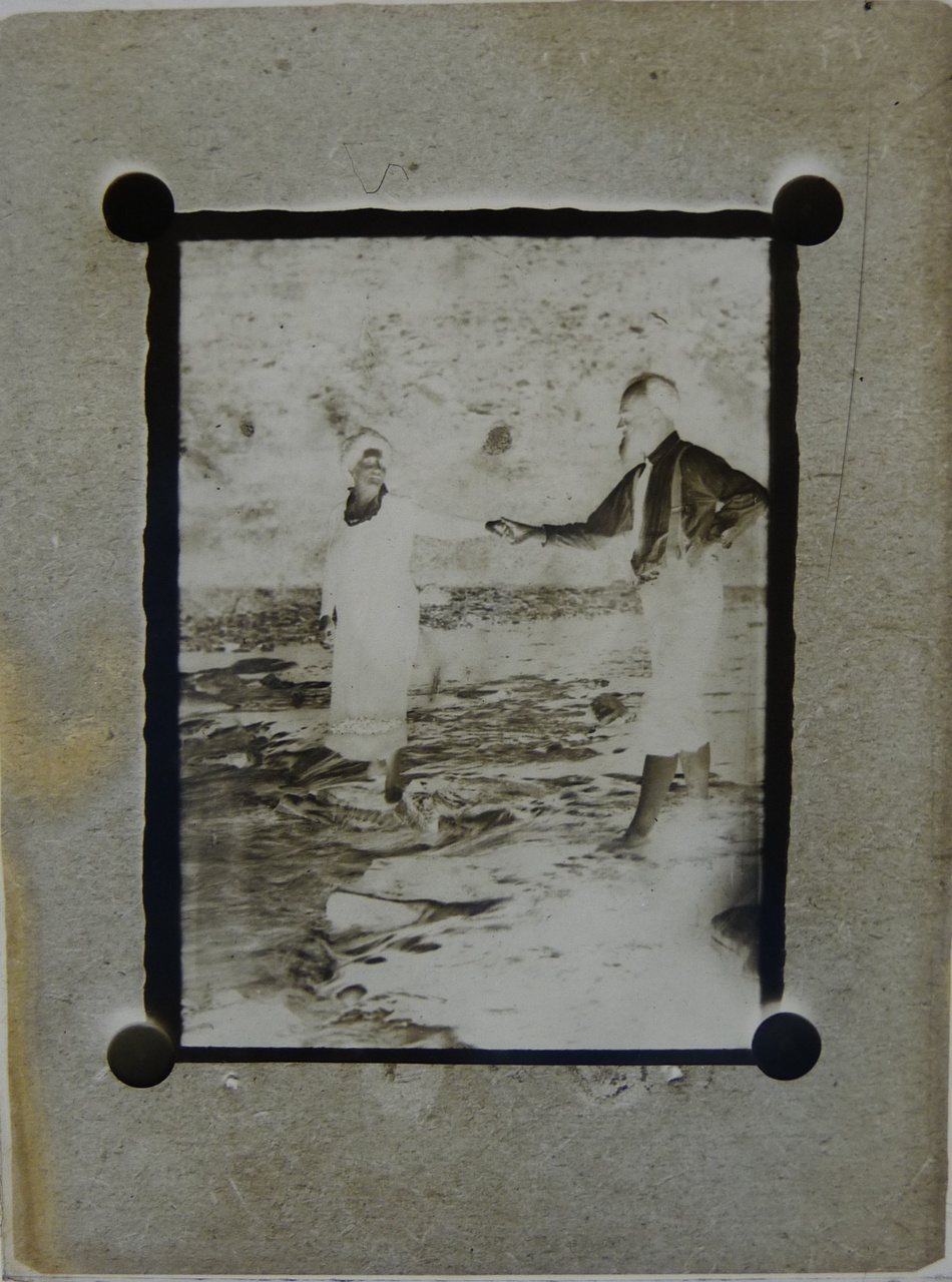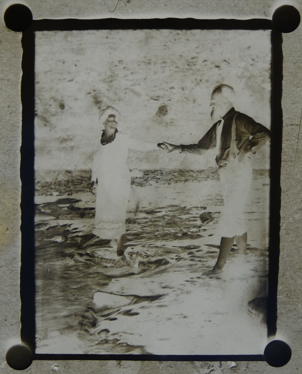 Op het negatief staan Jos Cuypers en Delphine Povel afgebeeld, zij reiken elkaar de hand. Joseph heeft zijn broekspijpen opgerold, Beiden staan in het water.