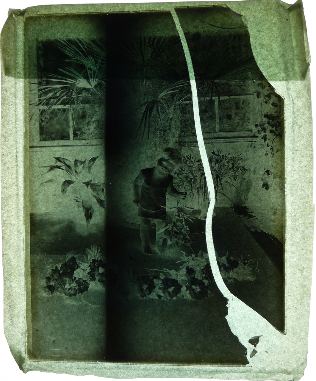 Glasnegatief van een foto van Charles Cuypers (als kind) in een serre