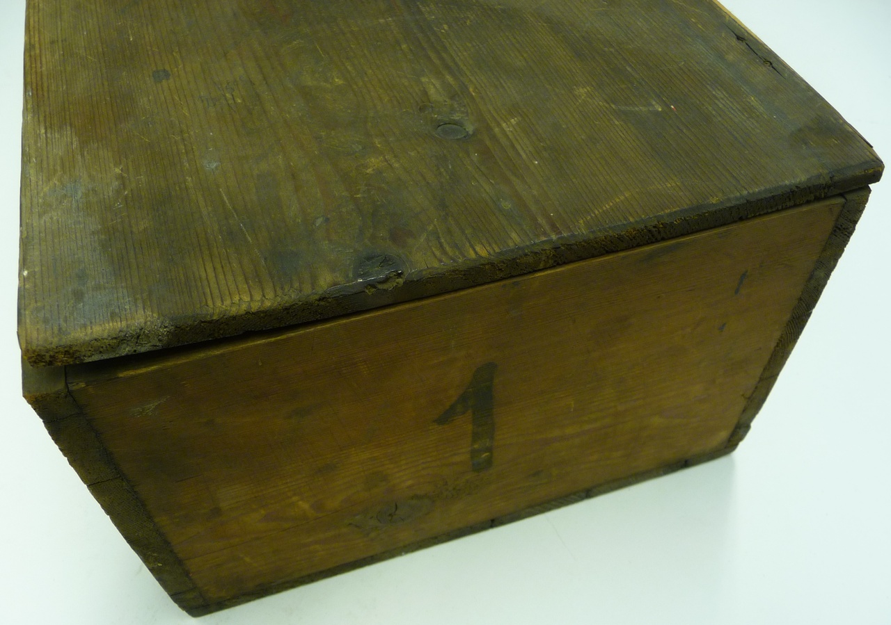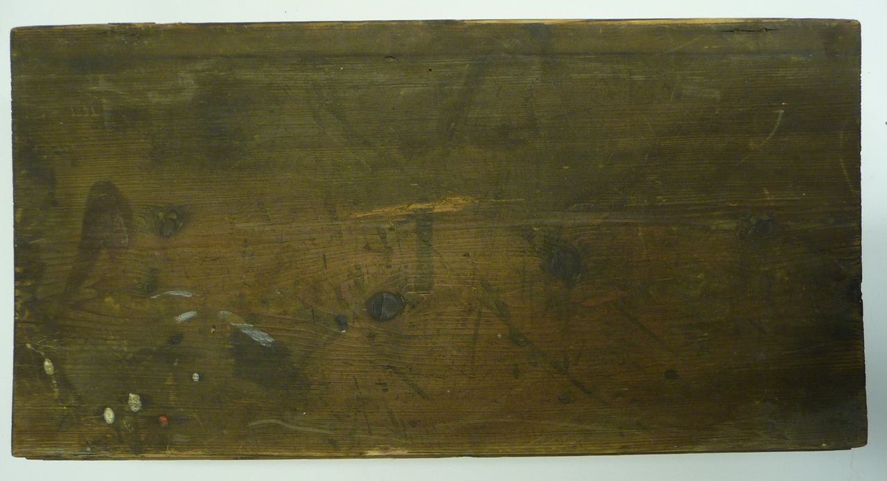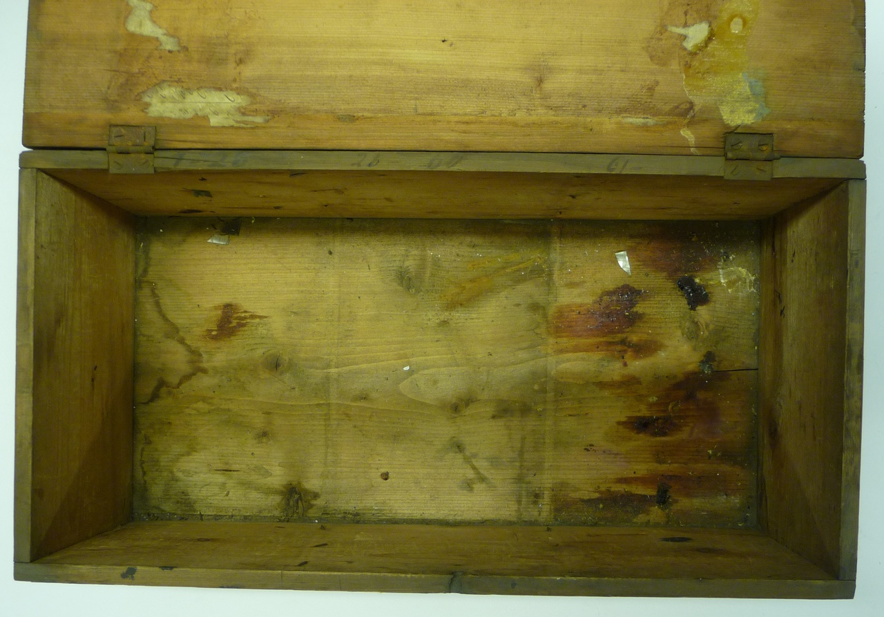 Op binnenkant deksel heeft iets geplakt gezeten; lijmresten en papier zichtbaar, maar verwijderd. In potlood woorden zichtbaar, moeilijk leesbaar, aantal keren het woord "statie".