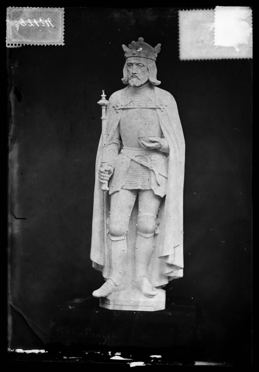 Op de foto is het beeld van een koning te zien. Hij heeft een volle haardos en baard en snor. Hij draagt een kroon en een geopende lange mantel. In zijn linkerhand houdt hij een staf en in zijn rechterhand een wereldbol. Het beeld staat op een sokkeltje. De achtergrond wordt toegedekt met een grijze lap stof of papier.