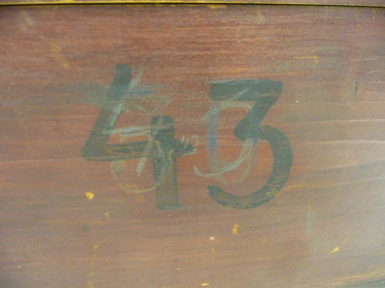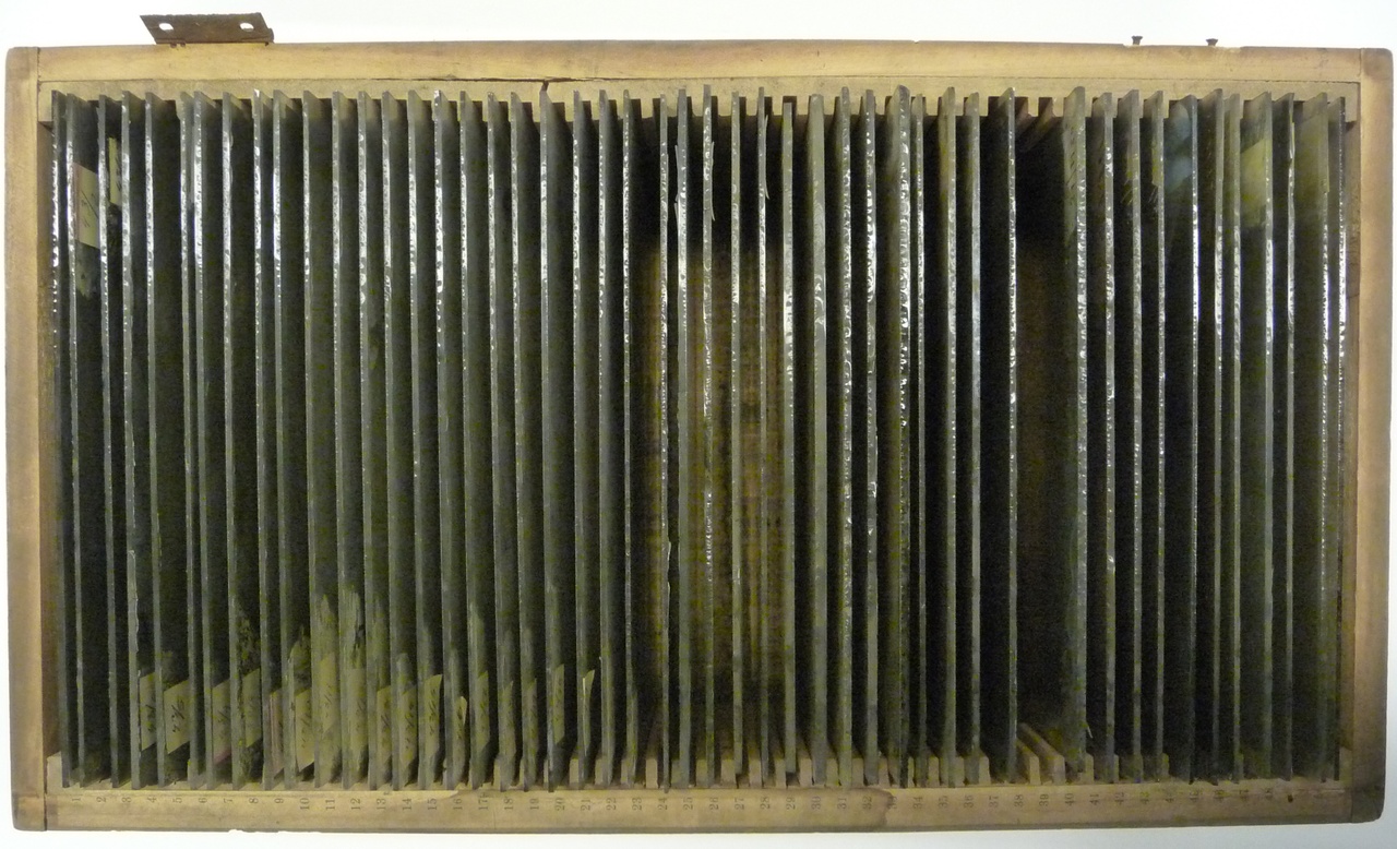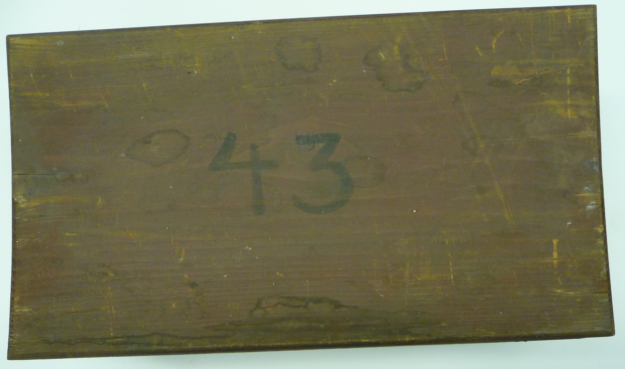 Kist met scharnierend deksel. Twee scharnieren rechts en twee haakjes links als sluiting. Op binnenkant deksel getypte lijst 43/1 t/m 43/50. Negatieven geordend van achteren naar voren en voorzien van etiket in bovenhoek, rechts of links, nr. 50 heeft geen etiket.
