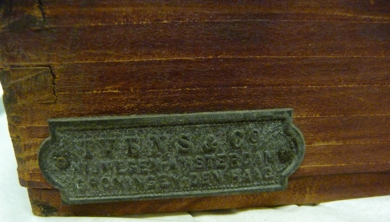 Op de zijkant rechtsvoor zit een metalen plaatje met de tekst: "Ivens & Co Nijmegen, Amsterdam, Groningen, Den Haag".