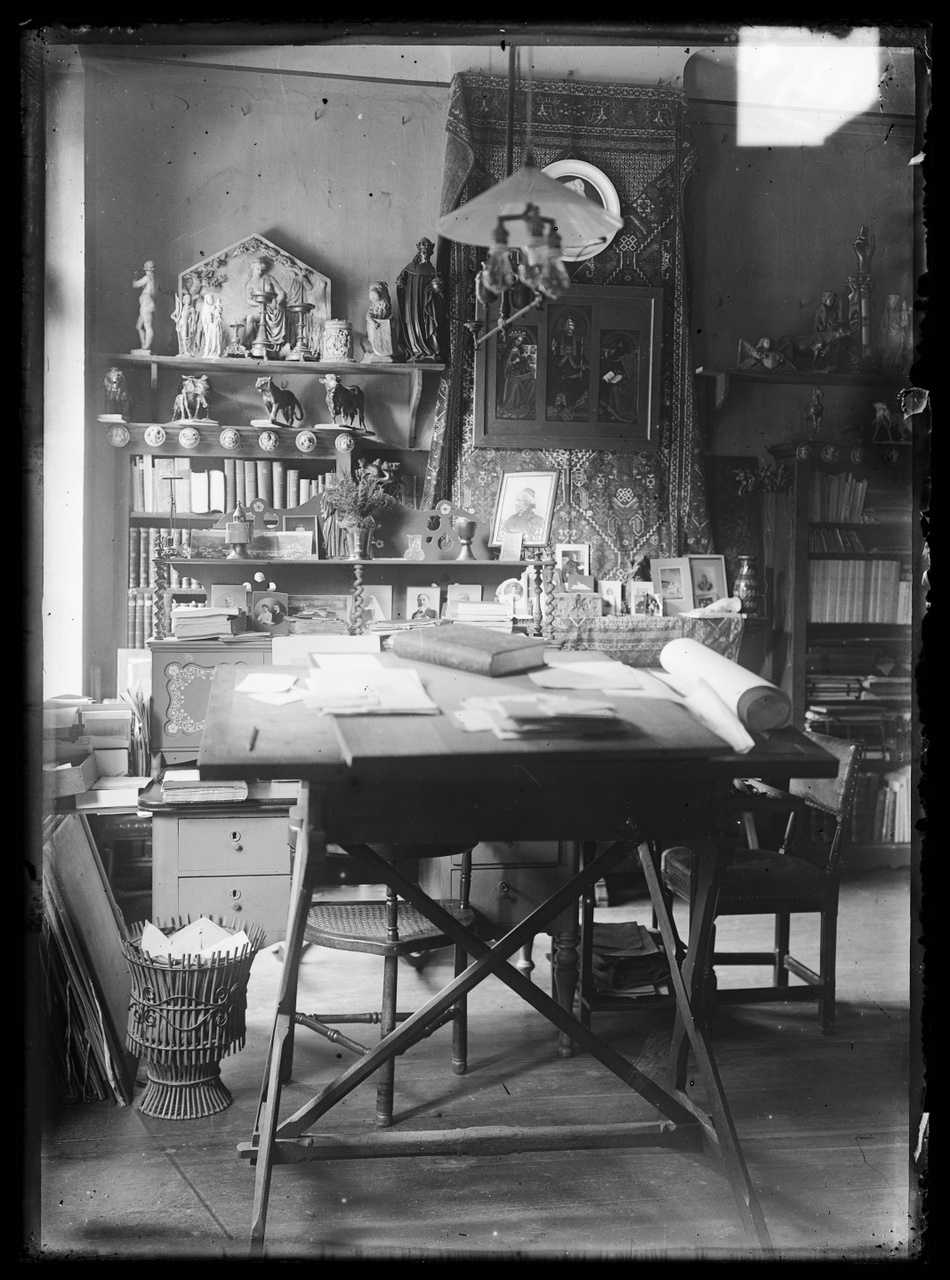 Glasnegatief van foto van producten uit de Cuypers' Kunstwerkplaatsen: "Foto van een rommelig interieur".
