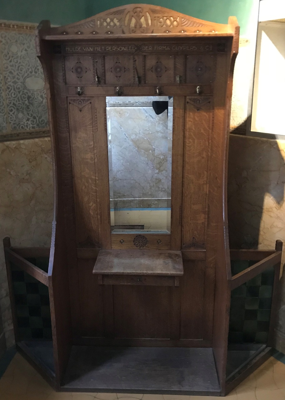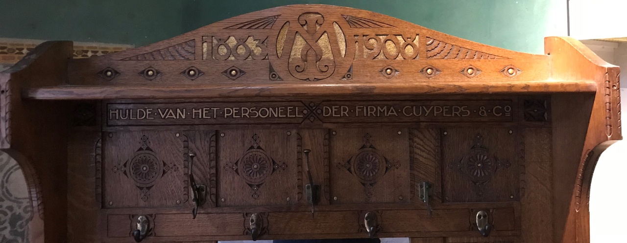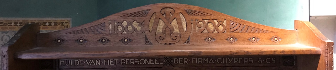 Direct boven de spiegel is de tekst aangebracht: "Hulde van het personeel der firma Cuypers & Co". In de bovenlijst is uitgesneden: 1883-1908. Tussen de beide jaartallen is een soort monogram uitgesneden dat de letters IM of MI of OIM, OMI, MIO, MOI, IOM of IMO omvat.