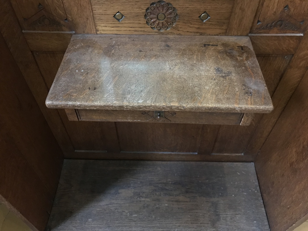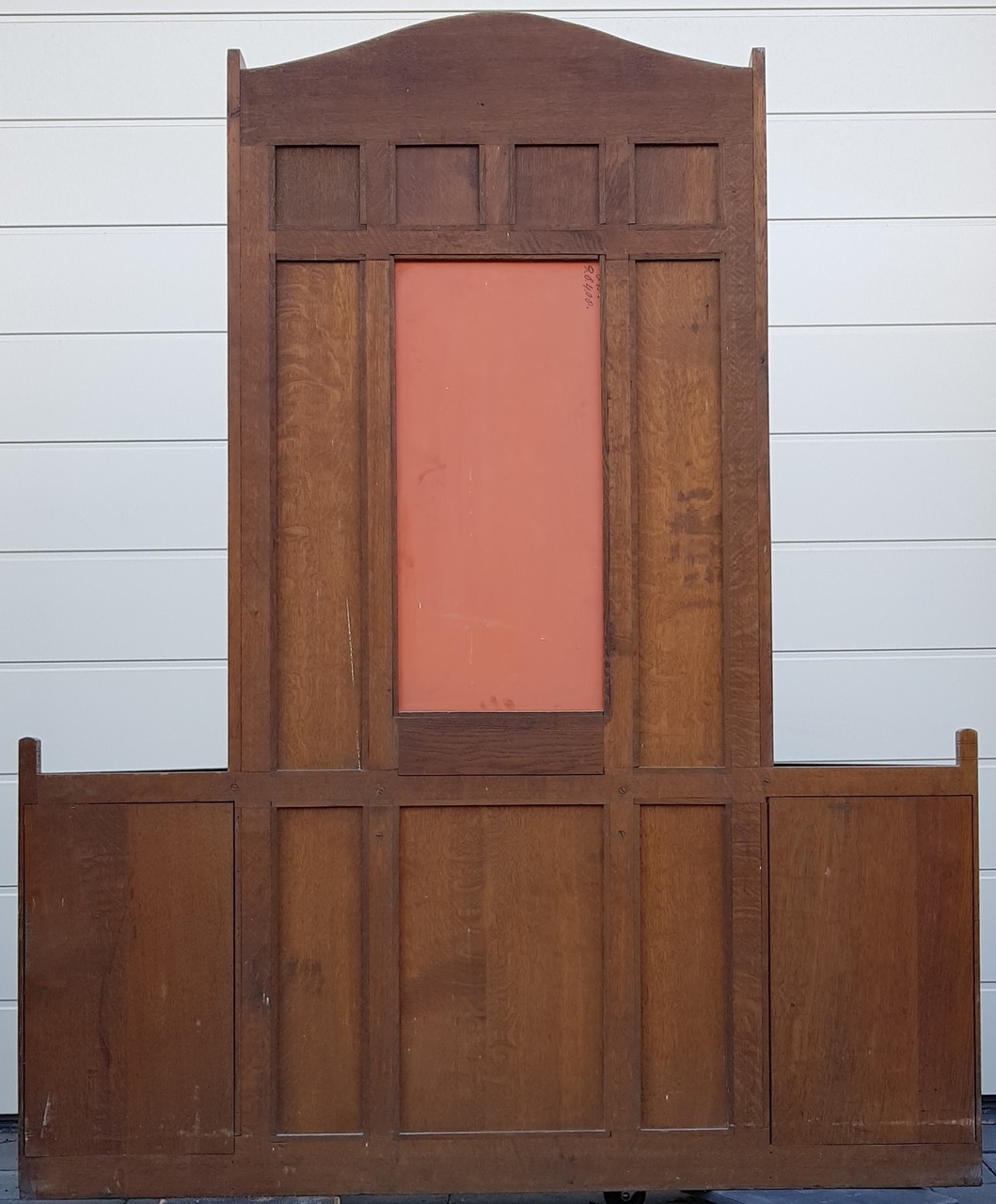 De spiegelkapstok bestaat uit een spiegel waarboven drie grote en vier kleine ophanghaken. Een van de drie grote haken is voor de helft afgebroken. Direct onder de spiegel is een handschoenenlade bevestigd.