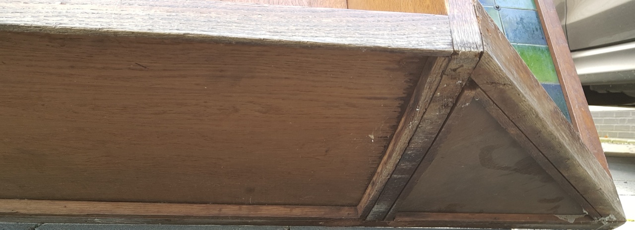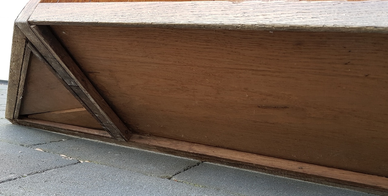Om de stabiliteit te vergroten is de kapstok voorzien van twee zijvleugels, waarin paraplus kunnen worden opgeborgen. De achterwand van deze twee parapluruimtes is bekleed met groene en zwarte tegeltjes, terwijl de bodem is voorzien van een zinken bak.