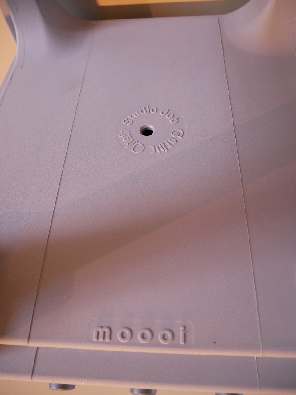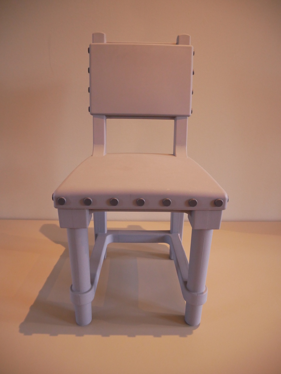 Rechte (eetkamer)stoel, uitgevoerd in grijs met donkergrijze knoppen langs de zitting. De stoel is vervaardigd uit polyetheen, de knoppen zijn van abs-rubber.