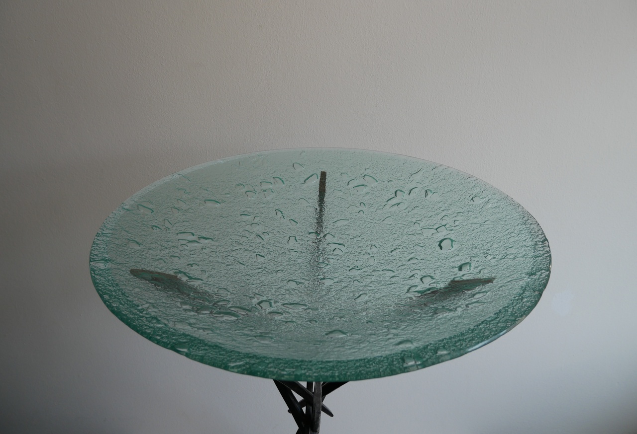 Voor de Zorgvlietkerk in Scheveningen ontwierp de predikant ds. C.J. Holemans samen met architectenbureau Braaksma & Roos deze doopvont en een tafel en kandelaar in een uitvoering met blauw staal en gehard glas. Het glas werd gegoten op een zandbed, waardoor het oppervlak licht gematteerd is.