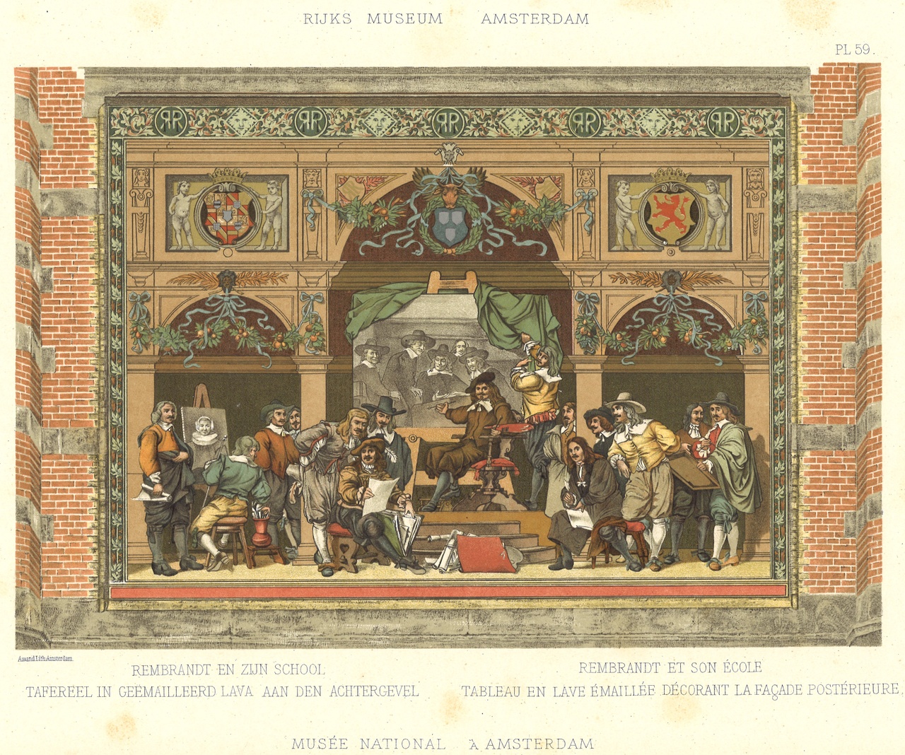 - Plaat 59 (6652cg) geeft een kleurentekening weer van "Rembrandt en zijn school", een tafereel in geëmailleerd lava op de achtergevel.
