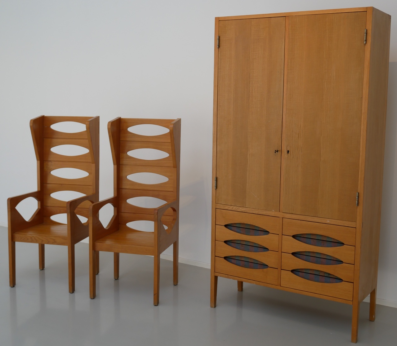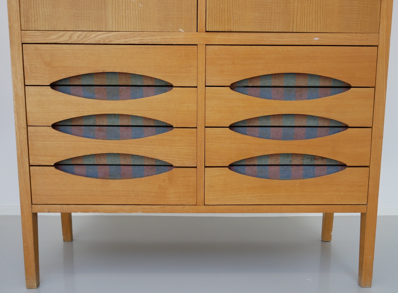 Rechthoekige kast met twee afsluitbare deuren en acht laden. Achter de ovaalvormige uitsparing zit blauw-rood geruit textiel. Zes legplanken. Eén sleutel aanwezig.