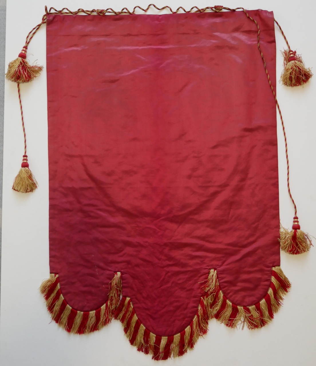 De midden-applicatie is geschilderd op witte zijde, de lijnen zijn opgetrokken met genaaide randen. De applicatie is bevestigd op witte damast. De onderste geschulpte rand is voorzien van twee kleurig franje (rood en geel) en bovenaan zit een gegolfd koord (waarmee het aan een stok geregen kan worden), uitlopend in twee kwasten aan beide zijden.