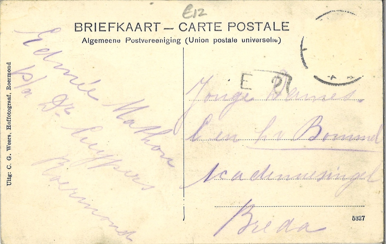 De foto lijkt veel op de ingekleurde foto 6693d, maar uiterst links staat het woonhuis van architect Bolsius (tegenwoordig Andersonweg 10) er maar zeer gedeeltelijk op.De achterzijde van de foto diende als briefkaart, hetgeen er ook op gedrukt staat: "BRIEFKAART - Carte Postale Algemeene Postvereeniging (union postale universell)". en "Uitg. C.G. Weers, Hoffotograaf, Roermon". De kaart is per post verzonden, maar de postzgel is er afgehaald en daardoor is ook de datum va het poststempel niet meer zichtbaar. De kaart was gericht aan de "Jonge Dames E. en L. van Bommel, Academiesingel, Breda". De afzender was Edmée Mathon, p/a Dr. Cuypers Roermond. Verder staat er geen boodschap op de kaart.