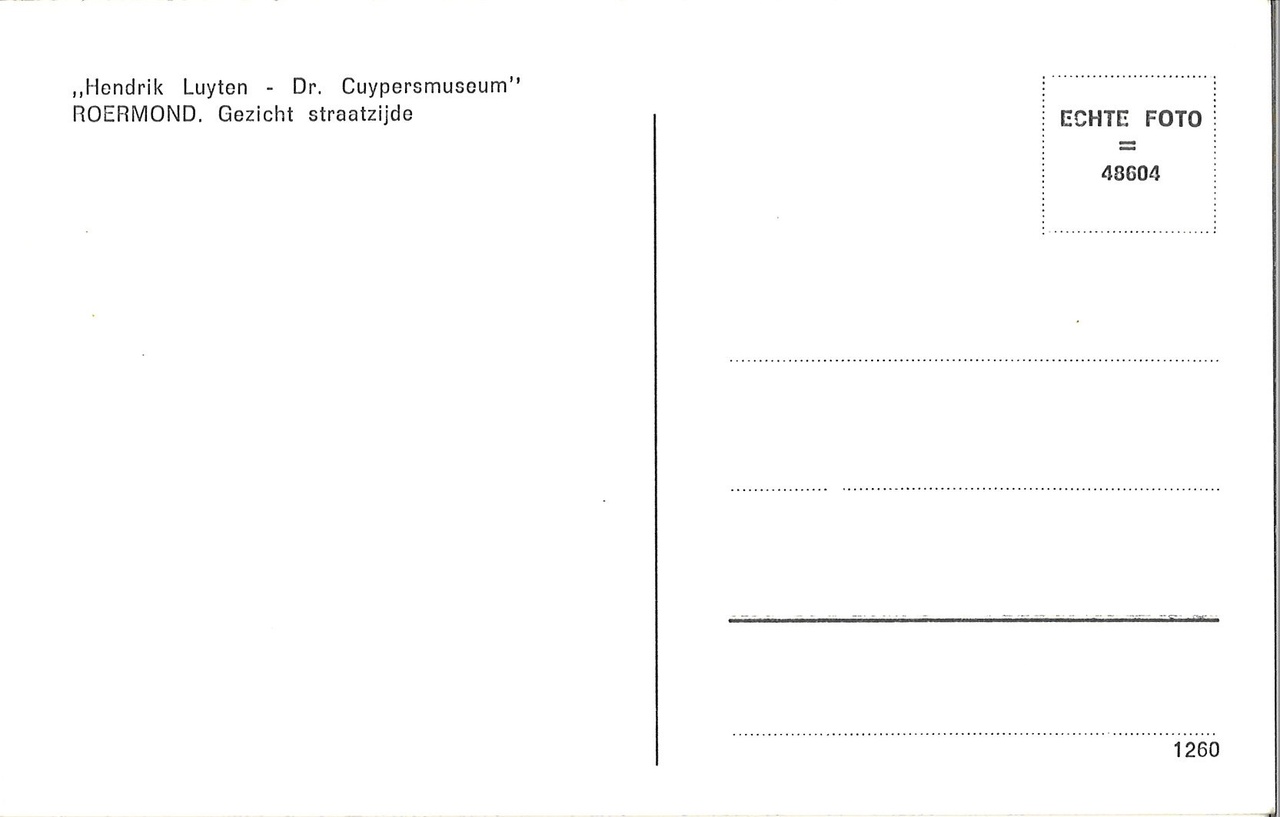 De achterzijde van de foto is opgemaakt als briefkaart, maar nooit als zodanig gebruikt. Er staat op gedrukt: "Hendrik Luyten - Dr. Cuypersmuseum". "Roermond. Gezicht straatzijde" en "ECHTE FOTO = 48604"Rechtsonder staat gedrukt "1260". Het nummer 1260 wijst er op dat de briefkaart in 1960 is gemaakt.