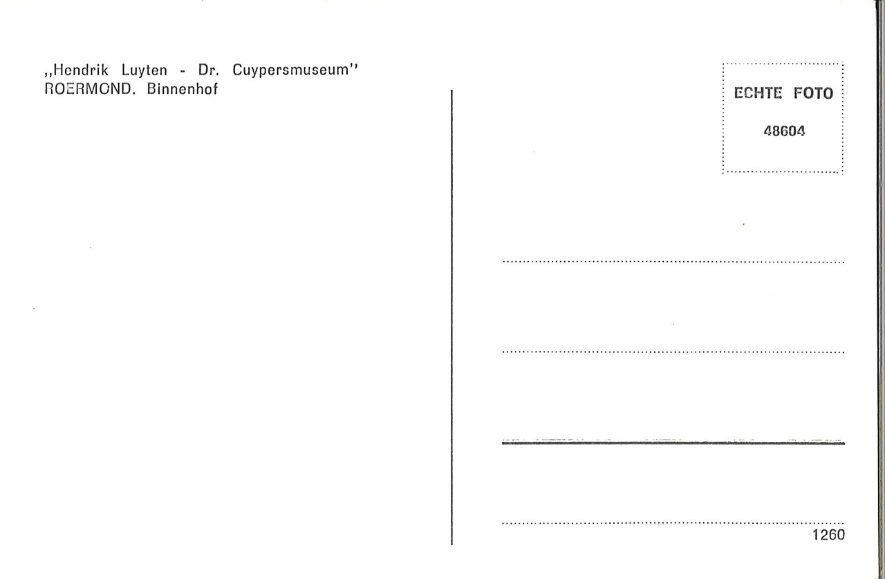 De achterzijde van de foto is opgemaakt als briefkaart, maar is nooit als zodanig gebruikt. Er staat op gedrukt: "Hendrik Luyten - Dr. Cuyersmuseum", "Roermond, Binnenhof" en "ECHTE FOTO 48604" en het nummer 1260. Dit nummer geeft aan dat de briefkaart in 1960 is geproduceerd.