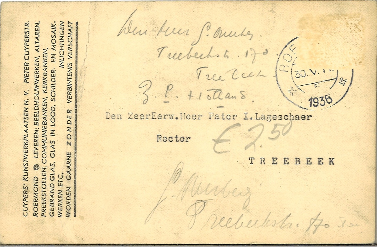 De briefkaart is op 30 mei 1936 verzonden van Roermond naar "Den ZeerEerw. Heer Pater I. Lageschaar, Rector, Treebeek". De postzegel is van de briefkaart afgeweekt, maar het poststempel is nog gedeeltelijk leesbaar.
