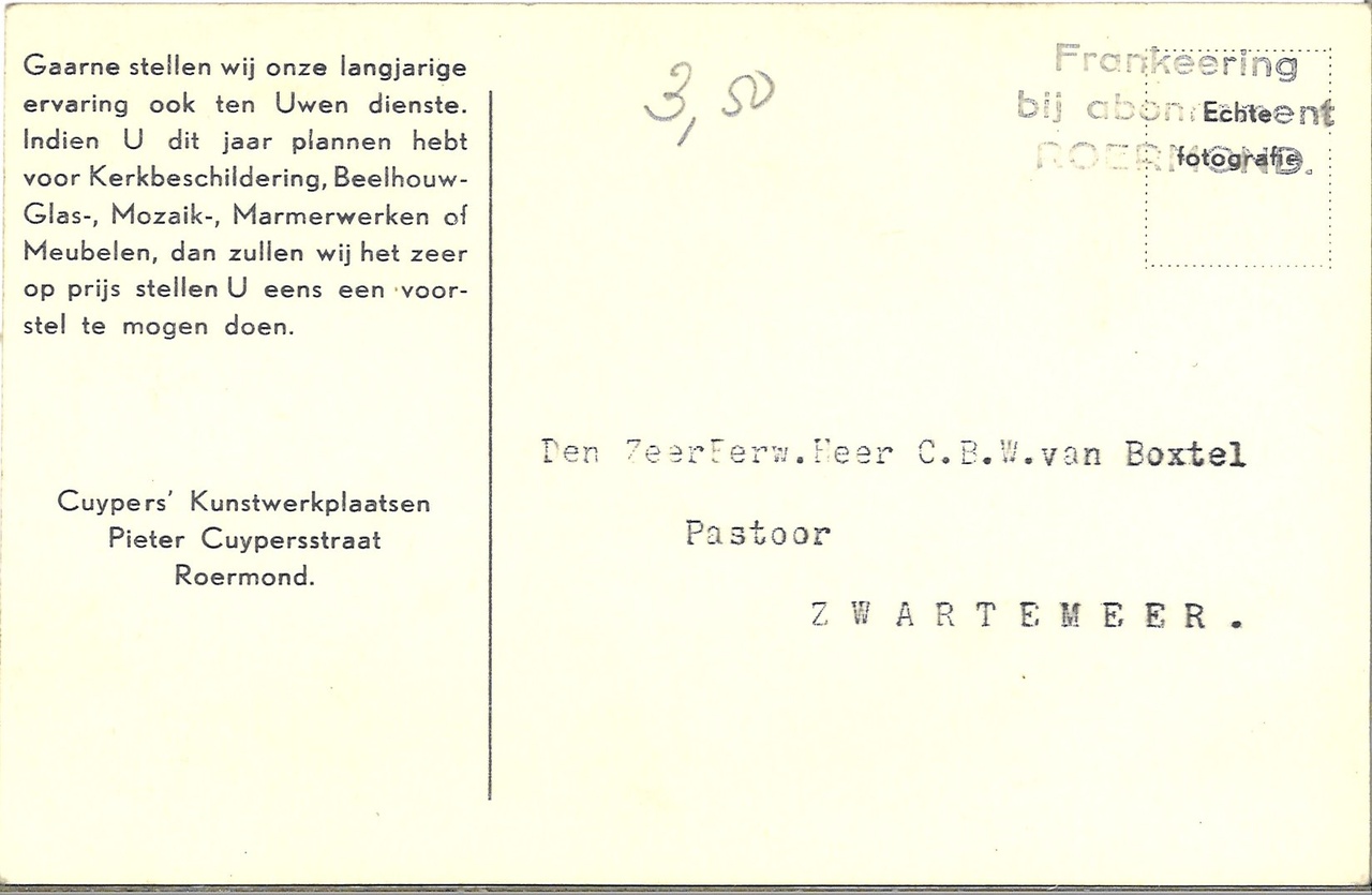 Op de achterzijde staat links gedrukt: "Gaarne stellen wij onze langjarige ervaring ook ten Uwen dienste. Indien U dit jaar plannen hebt voor Kerkbeschildering, Beeldhouw-, Glas-, Mosaik-, Marmerwerken of Meubelen, dan zullen wij het zeer op prijs stellen U eens een voorstel te mogen doen. Cuypers' Kunstwerkplaatsen, Pieter Cuypersstraat, Roermond'. De briefkaart bevat geen postzegel, maar is afgestempeld met "Frankeering bij abonnement Roermond". Het adres van de geadresseerde is getypt: "Den Zeereerw. Heer C.B.W. van Boxtel, Pastoor, Zwartemeer".