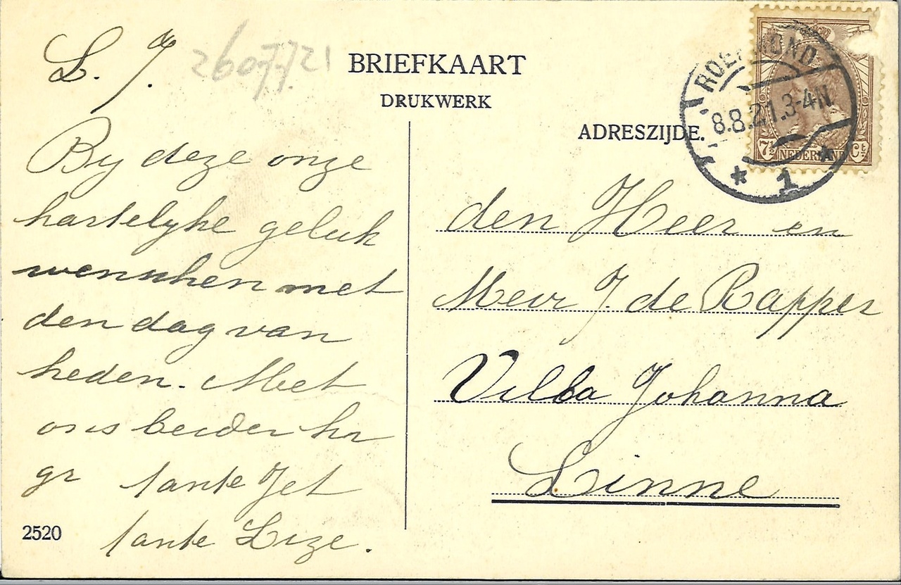 De briefkaart is gefrankeerd met een postzegel van 7½ Cent en afgestempeld op 8 augustus 1922 en geadresseerd aan: "den Heer en Mevr. J. de Rapper, Villa Johanna, Linne". De tekst luidt: "L.J. Bij deze onze hartelijke gelukwenschen met den dag van heden. Met ons beider hr. gr., Tante Jet, Tante Lize".