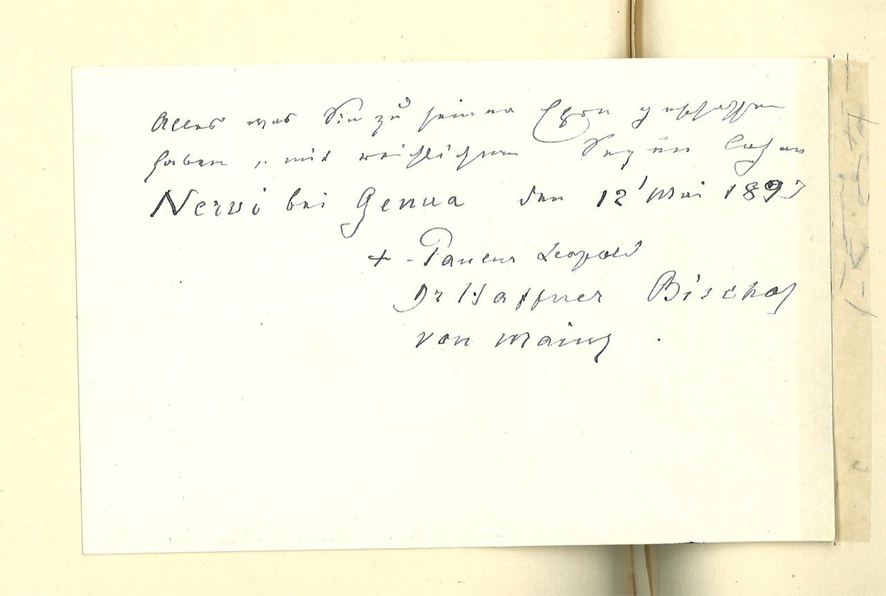 De wenskaart is tweezijdig beschreven in het Duits(?) op12 mei 1897 te Nervi bij Genua door Paulus Leopold Dr. Haffner, Bisschof von Mainz