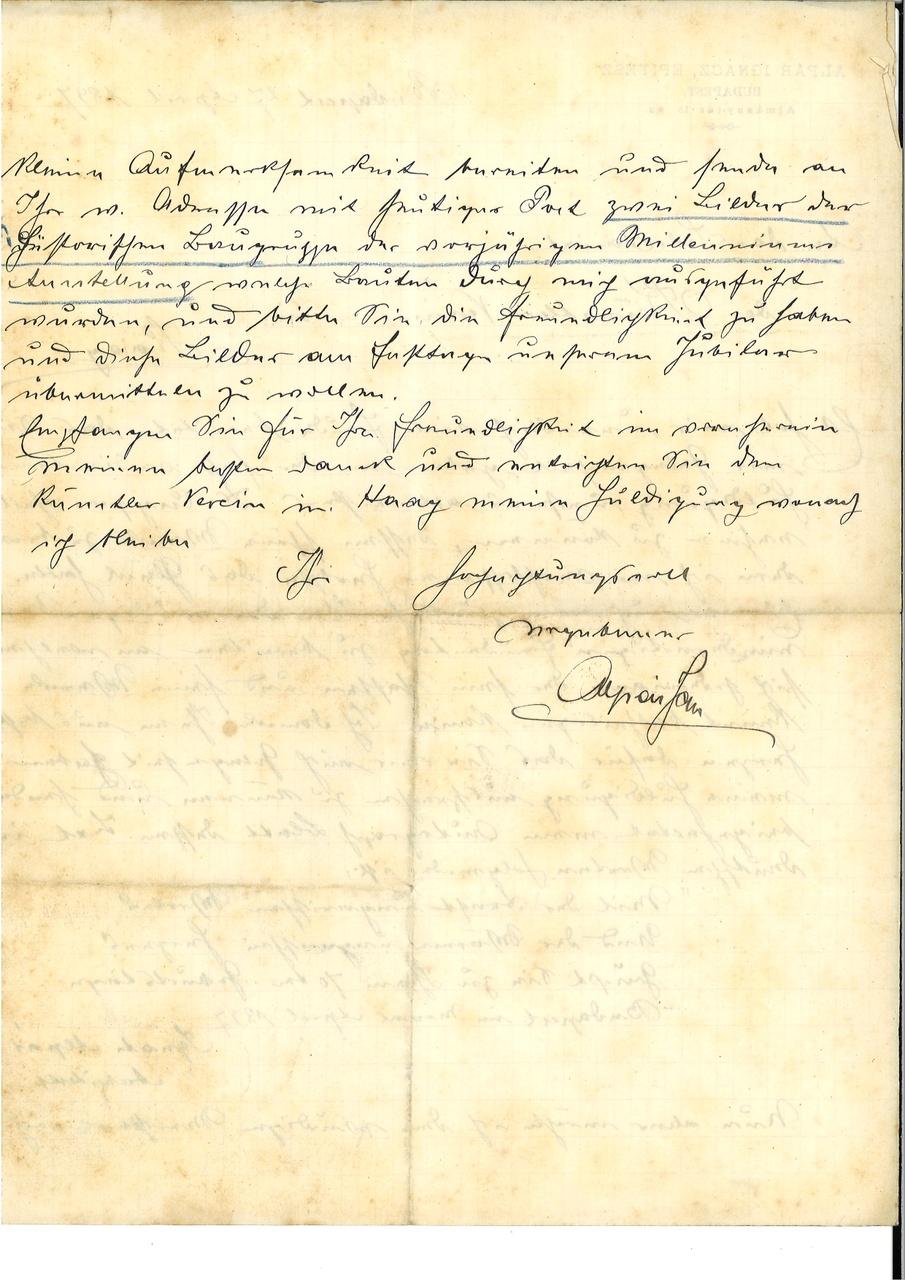 Dhr. Alpar Ignacz, Epitesz (architect) te Boedapest schrijft op 27 april 1897 een brief van twee kantjes aan het secretariaat des Künstler Kreis in Den Haag. De brief is in vrijwel onleesbaar Duits geschreven.