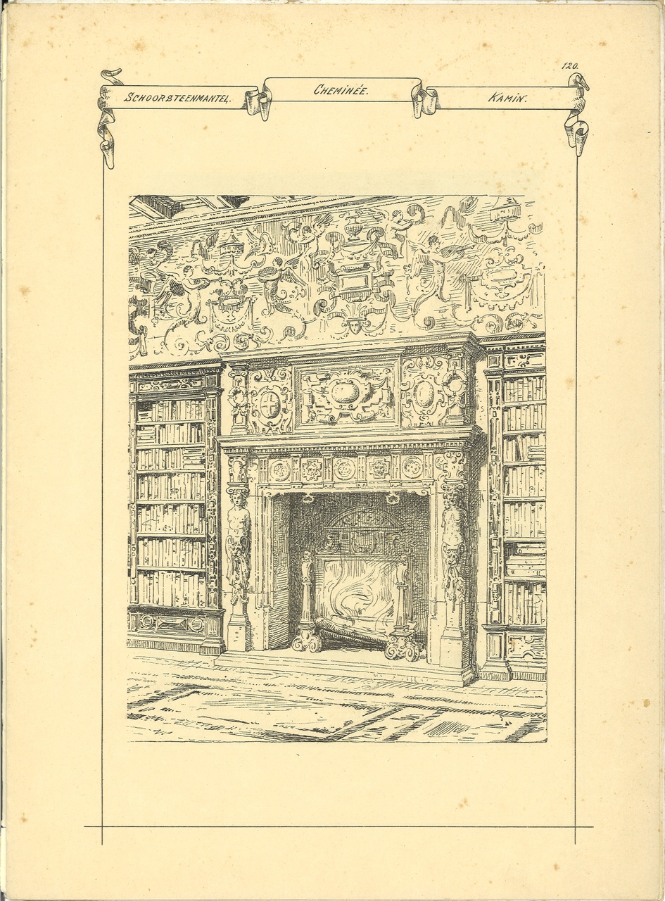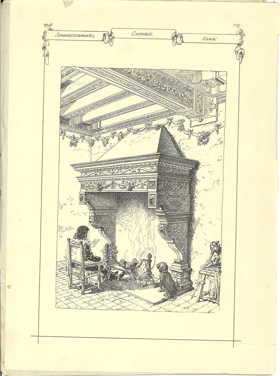 - op 6748-08 staat een schets van een schoorsteenmantel met daaronder een brandend haardvuur.
