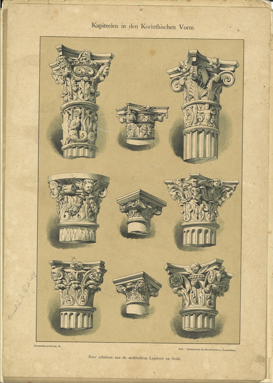 - Op 6748-05 staan "Kapiteelen in den Korinthischen Vorm". Met potlood staat in de marge geschreven: "roset in de lijst inslag" en bij het kapiteel linksonder staat een kruisje. Op de achterzijde staat een stempel: "P. Smeets, Beeldhouwer en Meubel- en Kerkwerken, Roermond".