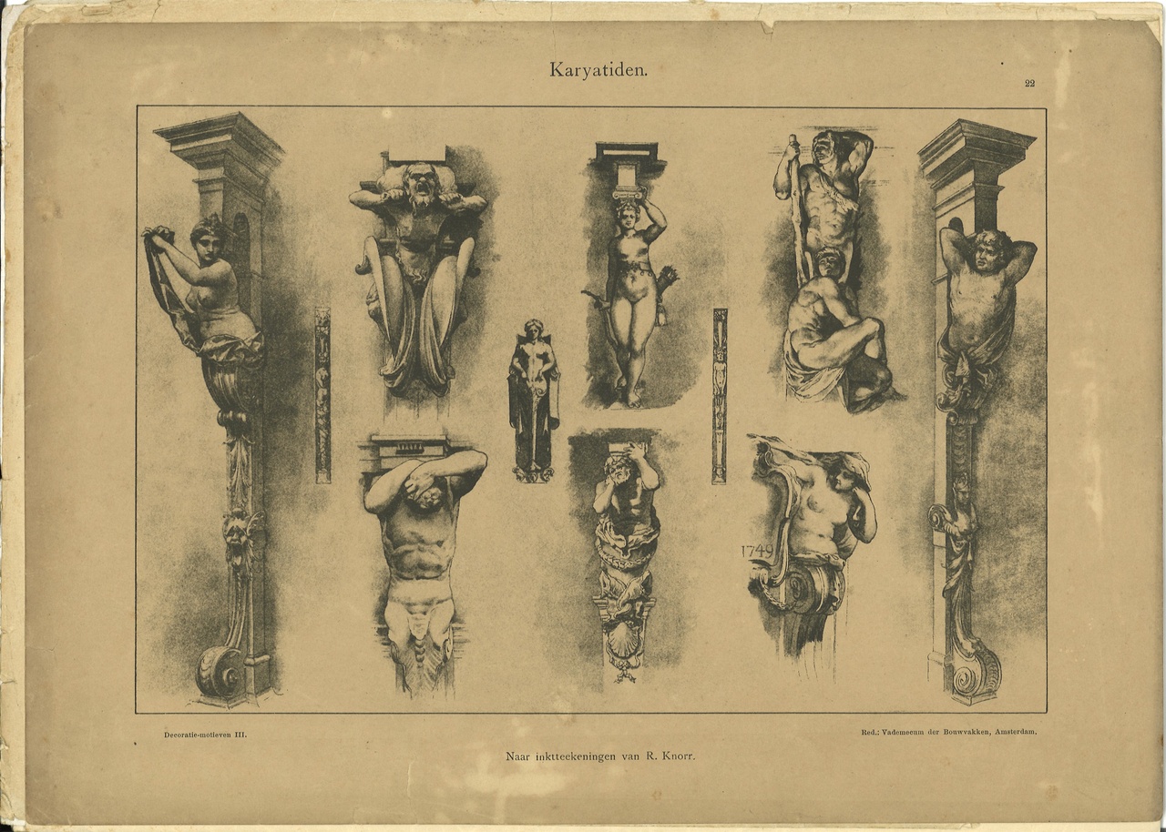 - 6748-06 toont afbeeldingen van dragende zuilen met menselijke figuren "Karyatiden". Ook op deze afbeelding staat het stempel van P. Smeets achterop.