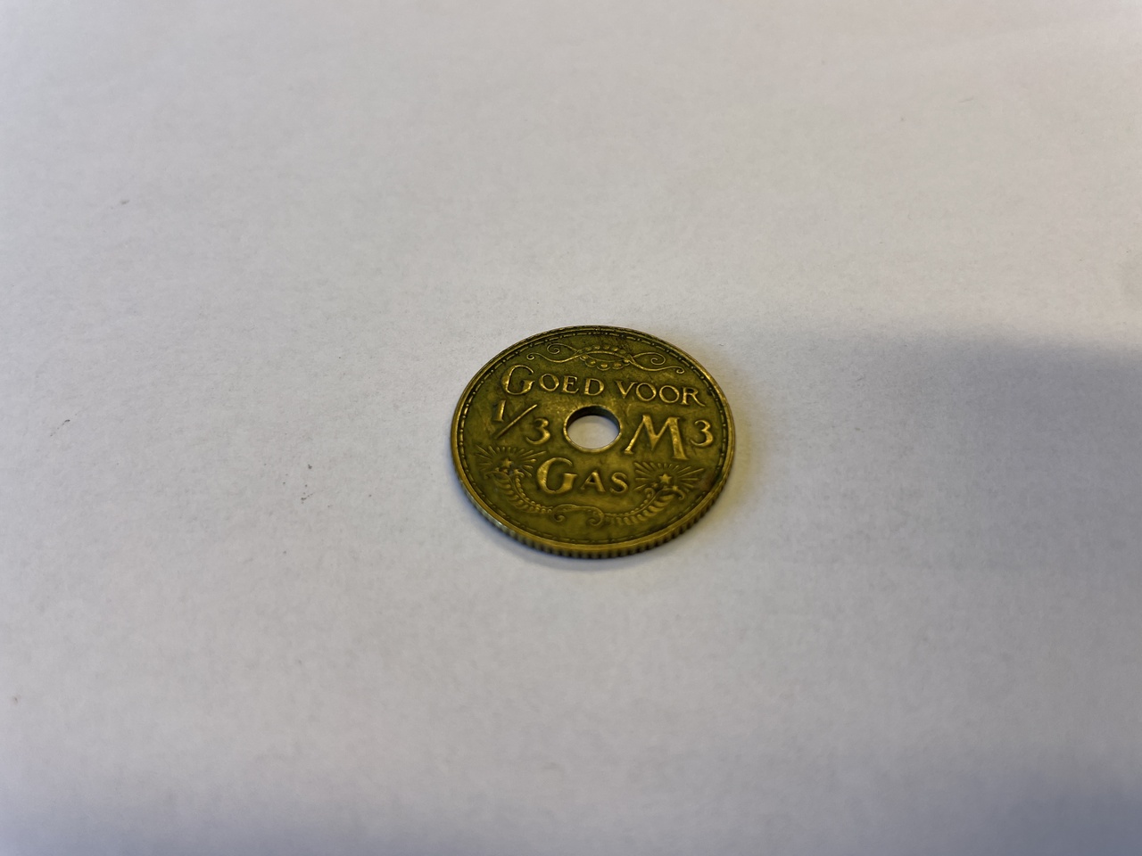 De gaspening was van het gemeentelijk gasbedrijf Roermond. Op de voorzijde staat het gemeentewapen afgebeeld en op de achterzijde staat de tekst: "Goed voor 1/3 m3 Gas".