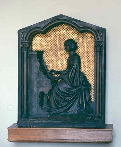 De architect Pierre Cuypers schonk zijn vrouw Antoinette dit reliëf met haar portret bij de viering van hun eerste huwelijksjaar. Antoinette Cuypers-Alberdingk Thijm, een getalenteerd pianiste en zangeres, is afgebeeld als de Heilige Cecilia, patroonheilige van de muziek. Zij zit hier achter de piano die zij als huwelijksgeschenk van Pierre Cuypers kreeg.
