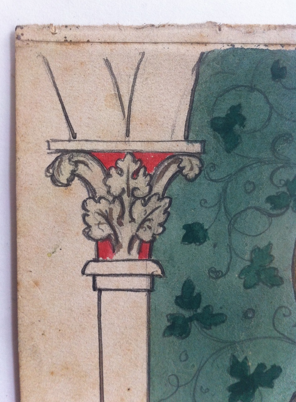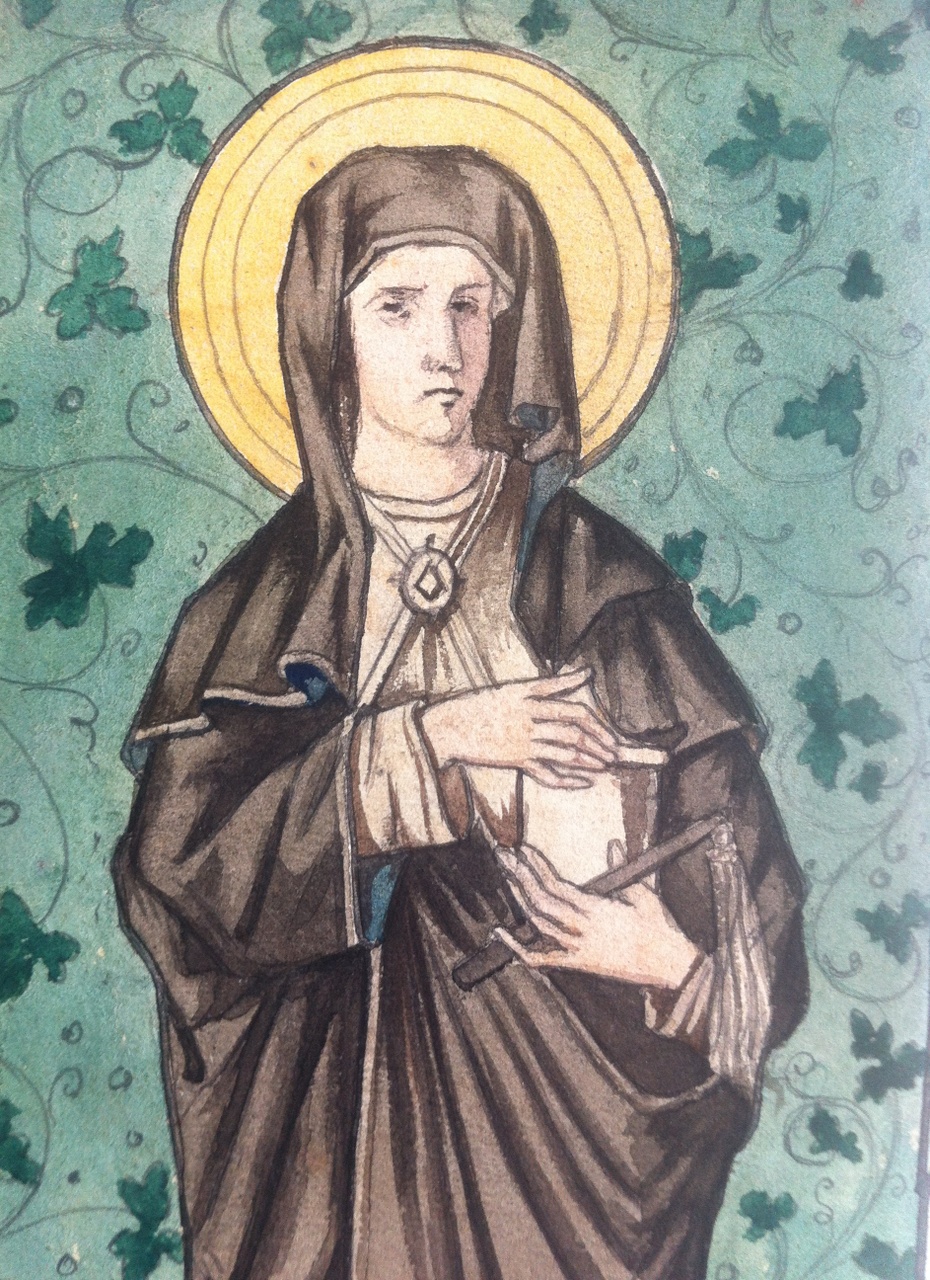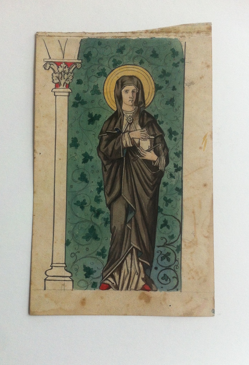 Op de ontwerptekening staat aan de voorzijde een vrouwelijke heilige met aureool afgebeeld. De achtergrond is groen met bladmotieven. Links staat een zuil afgebeeld. De heilige houdt in haar handen een potje o.i.d. en een stokje met een kwast.