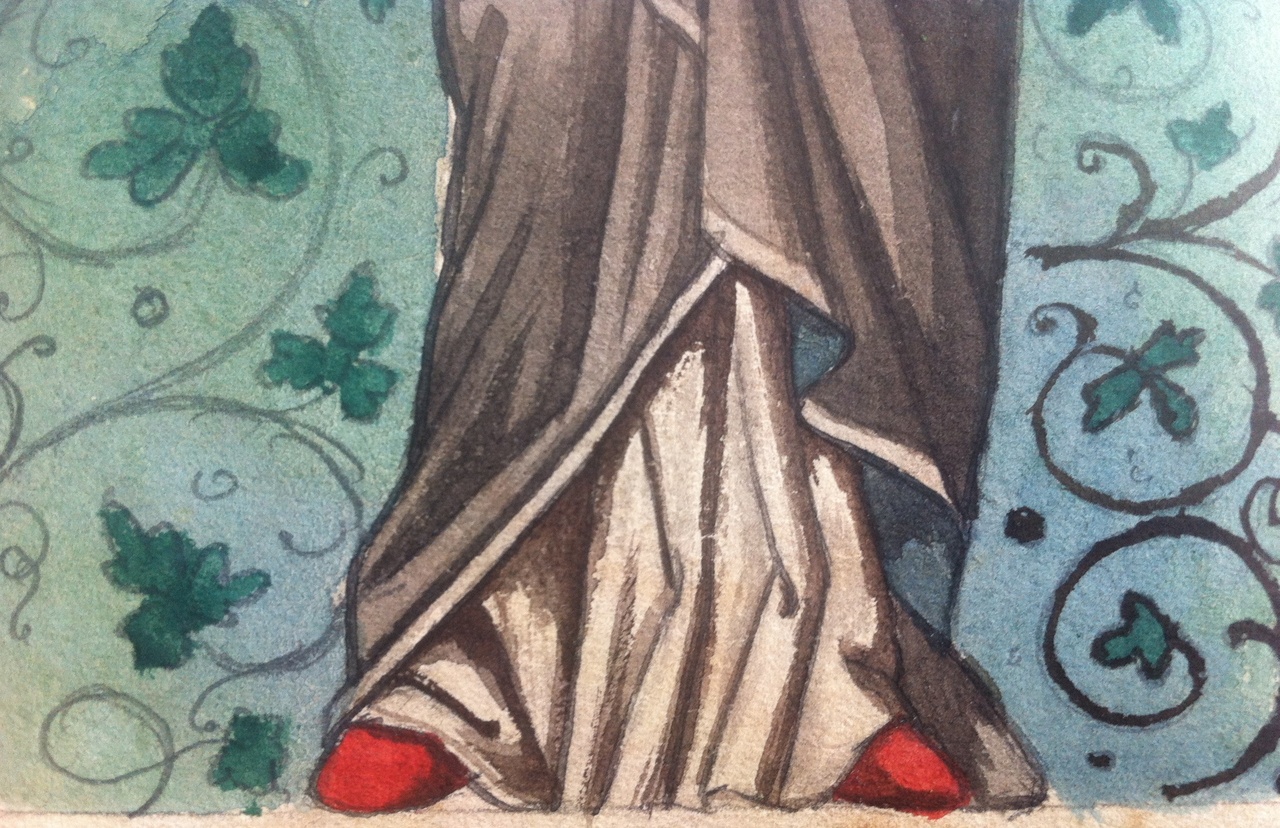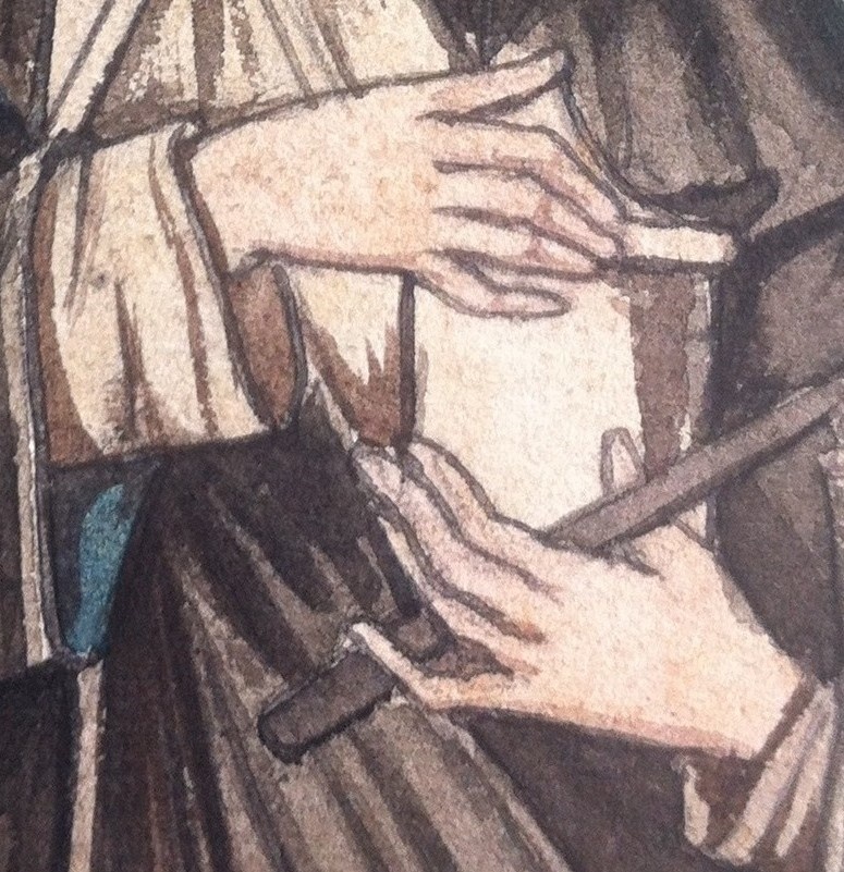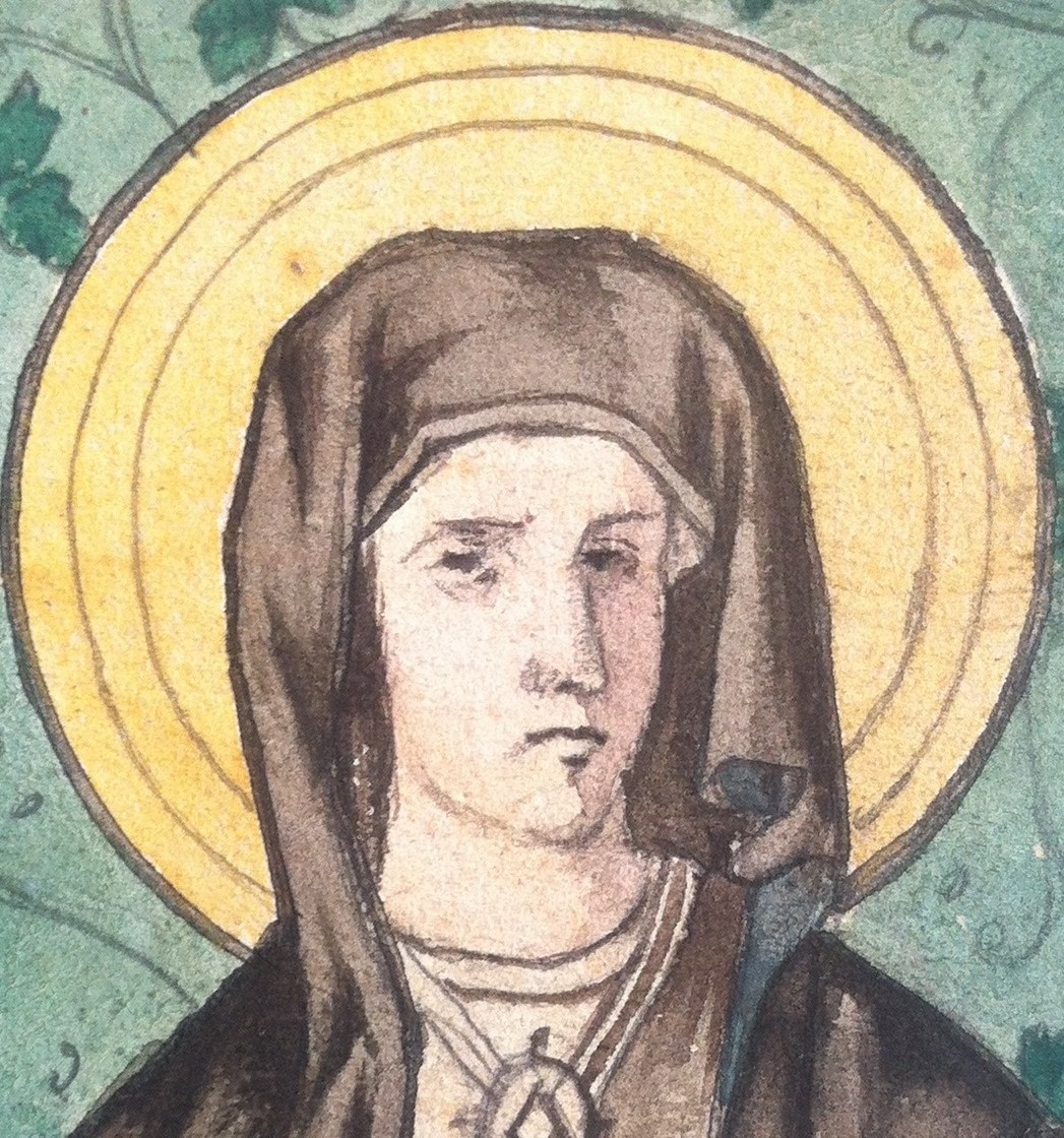 Op de ontwerptekening staat aan de voorzijde een vrouwelijke heilige met aureool afgebeeld. De achtergrond is groen met bladmotieven. Links staat een zuil afgebeeld. De heilige houdt in haar handen een potje o.i.d. en een stokje met een kwast.