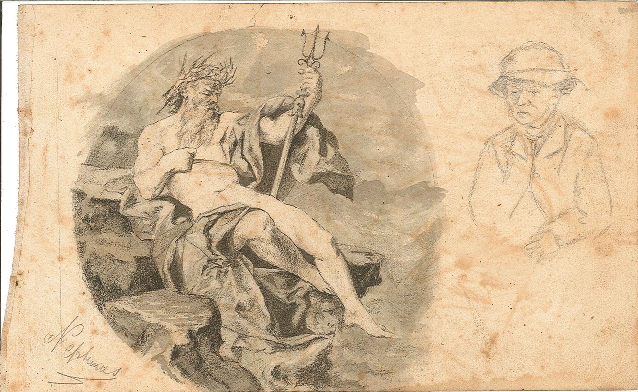 Op de achterzijde staat in zwart-wit de god Neptunus met drietand en daarnaast een potloodschetsje van een mannenfiguur.